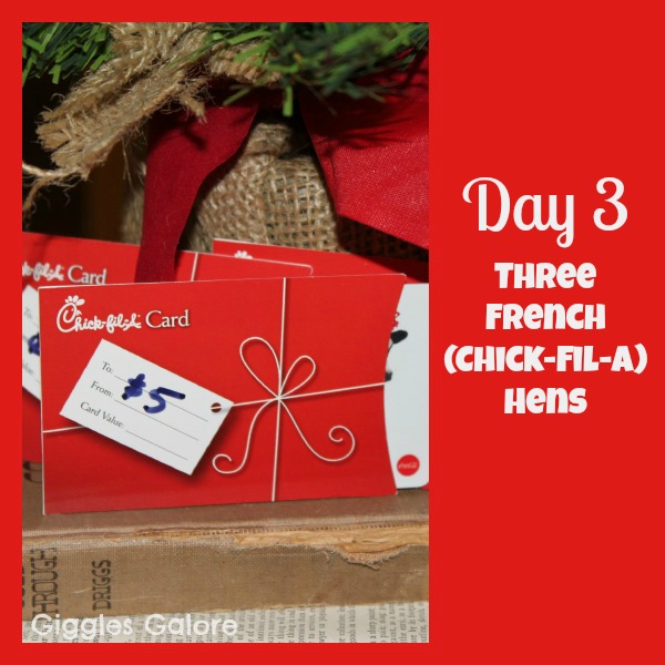 I simply purchased three $5 gift cards to Chick-Fil-A placed them in a gift bag and attached our clever poem.