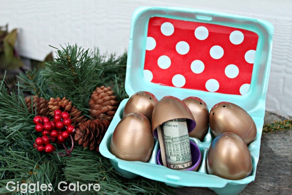 These golden eggs (spray painted Easter eggs) are filled with cash to help our special family pay some bills or splurge on a special Christmas treat.