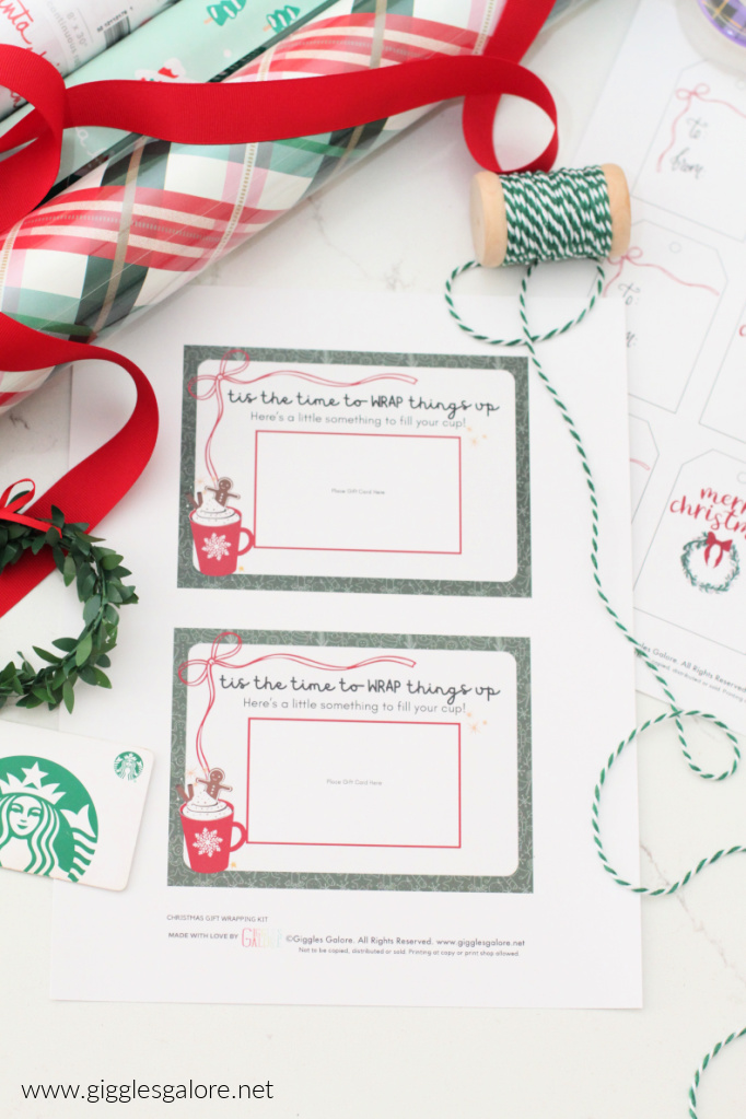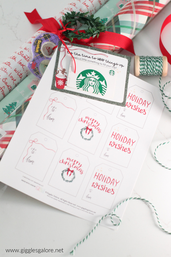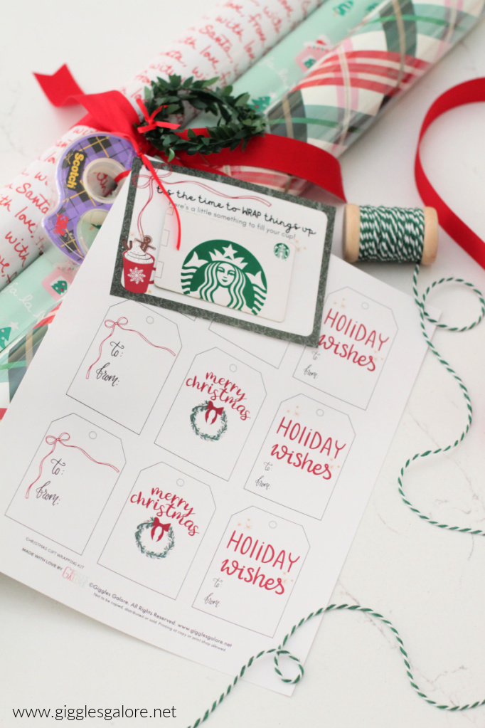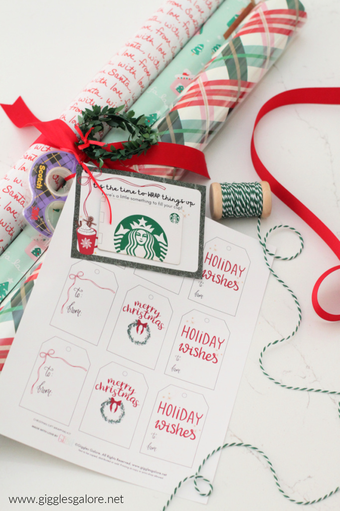 In each kit, I’m including a couple rolls of wrapping paper, tape, gift tags, and a gift card to their favorite coffee shop to help them power through wrapping all the gifts. I’ll be wrapping up everything nicely with a big bow and tag that reads: “Tis the time to wrap things up. Here’s a little something to fill your cup!” DOWNLOAD THE PRINTABLE TAGS HERE.