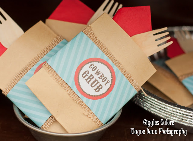 I purchased small brown paper bags from Michael’s (they have a huge variety in their celebration section) and wrapped them with a piece of burlap and one of the printables from the party package. We put the napkin and silverware in them so guest could easily grab them.