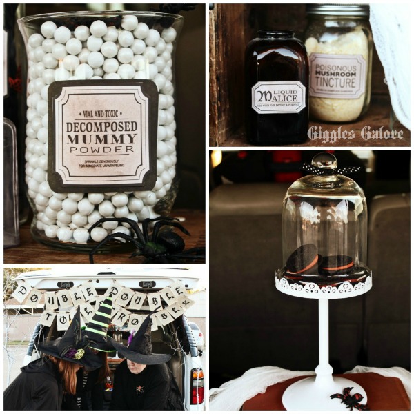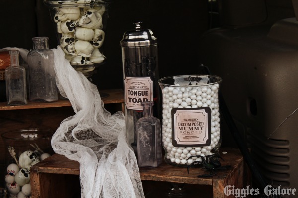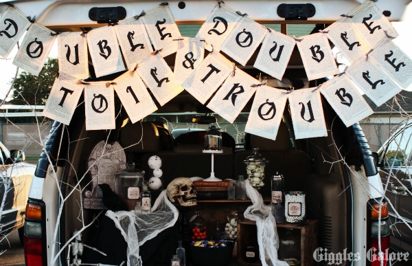 In the past my parents typically decorated their trunk while we wrangled kids and helped them go from car to car. This year we decided to put the men in charge of the kids and the girls hatched up a fabulous plan for a spooky trunk. We used the famous witches scene from Shakespeare’s Macbeth to create our haunted trunk. Double, double, toil and trouble. Fire burn and cauldron bubble.