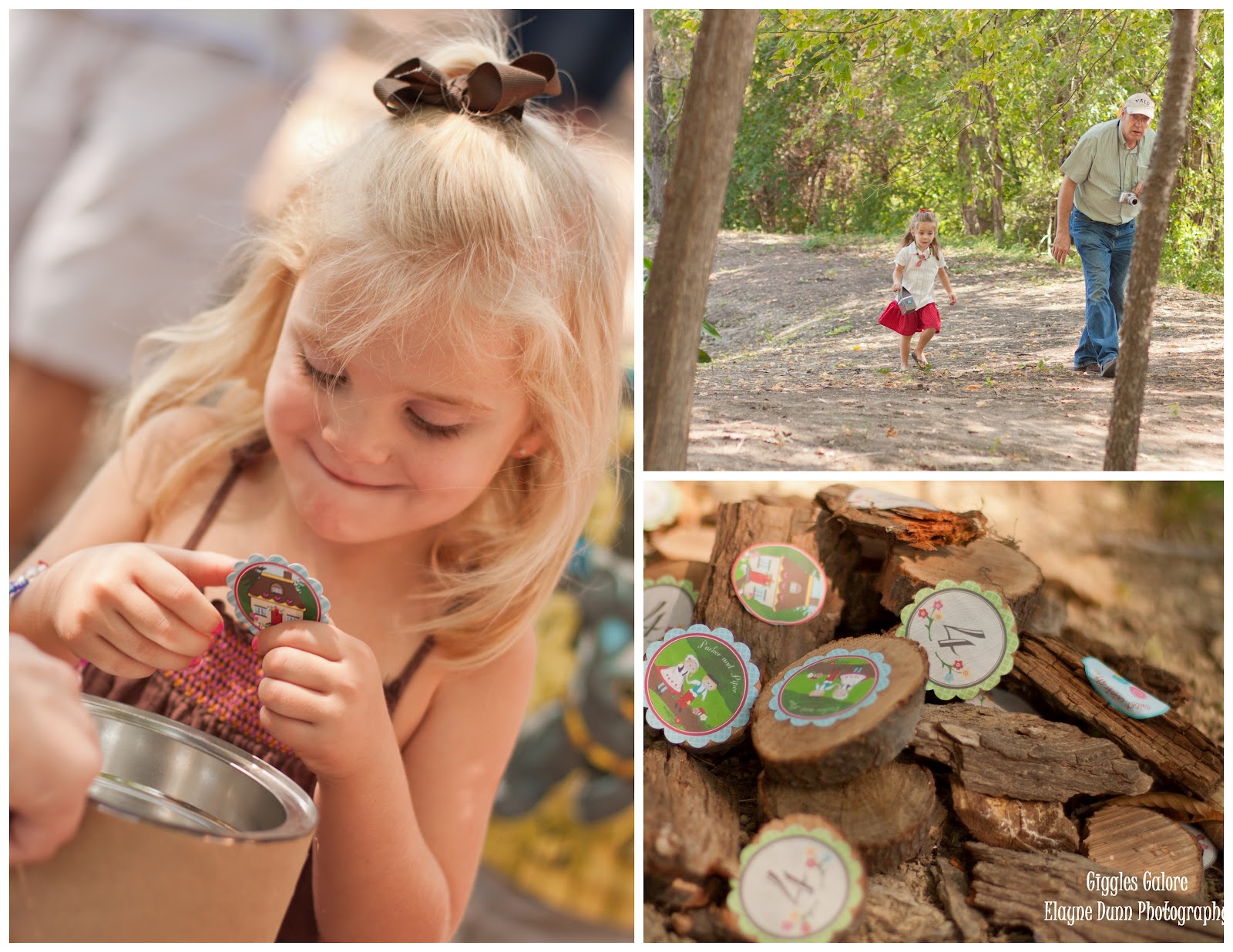 After decorating our houses we gathered everyone for an scavenger hunt in the woods. I printed the party circles and attached a set to mini wood circles my dad cut from tree limbs. I hid the wooden circles all throughout the wooded area and then each kid drew a party circle from the bucket and set off to find their matching image. Once they brought back their matching image they were given a candy necklace to put in their cottage favor box.