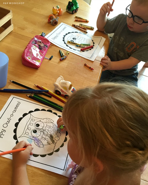 This was such a fun activity for my preschool age daughter and her little friend. They had a blast coloring the owls! For bigger kids, they can coloring in all the details on the owls themselves.