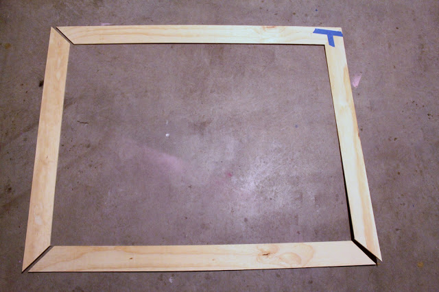 I wanted the frame to be light and easy to transport so I started with a 2×4 sheet of 3/16″ plywood. My hubby cut 4 strips 4″ wide and then cut 2 sides 10″ shorter to make the total size of the frame 38 x 48.