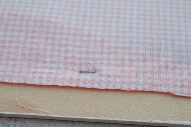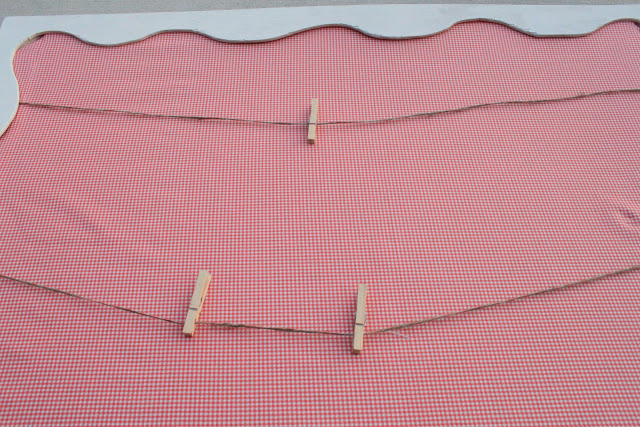 I wanted to be able to use this frame for future parties so I spray painted it a neutral cream. Then I used a yard and a half of fabric and tightly stretched it across the back of the frame. Staple in place and cut or pin back an excess.