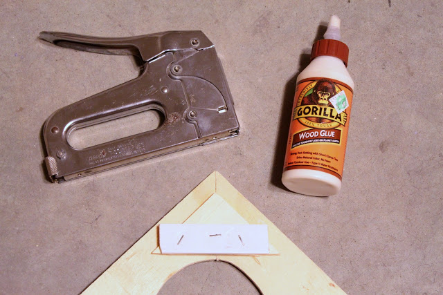 Now it’s time to put the frame together. Use wood glue to secure each side, for added strength use the corner piece discarded from when you cut the mitered corners and attach it with a heavy duty staple gun.