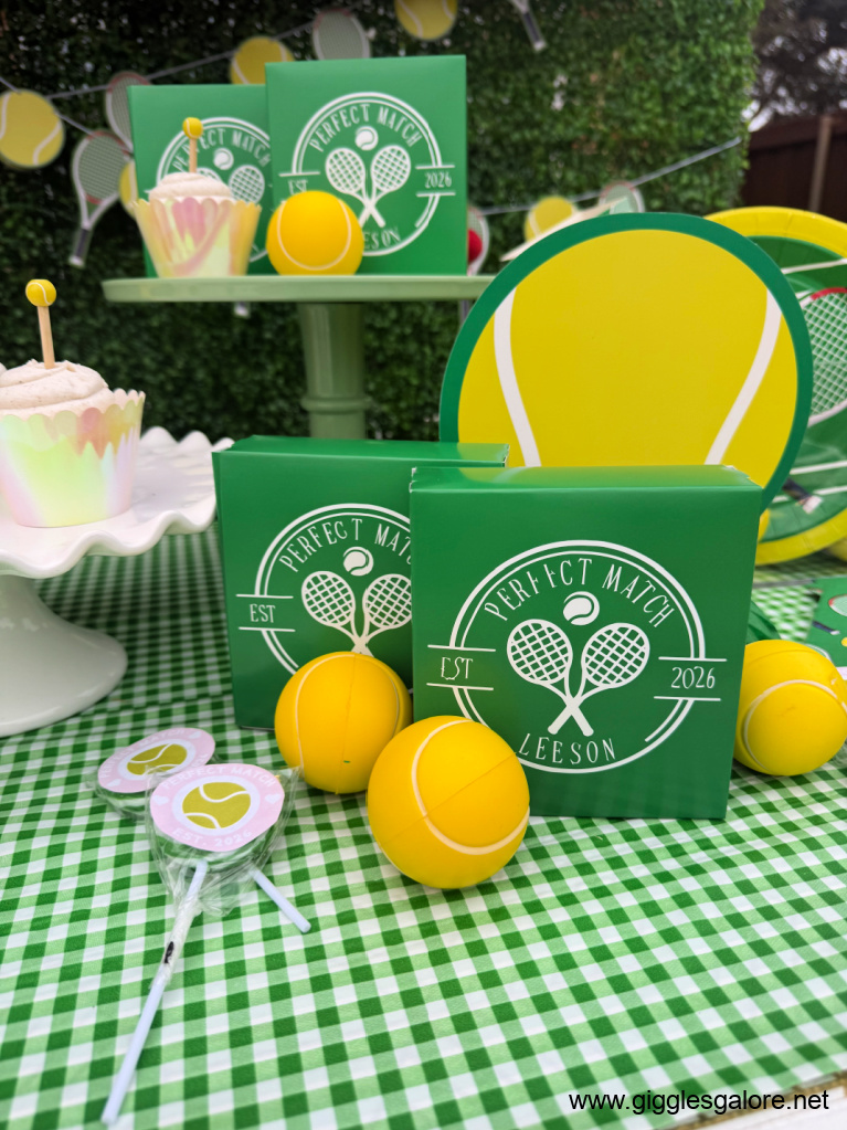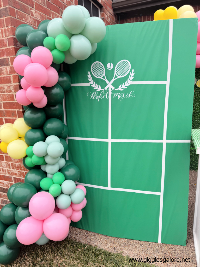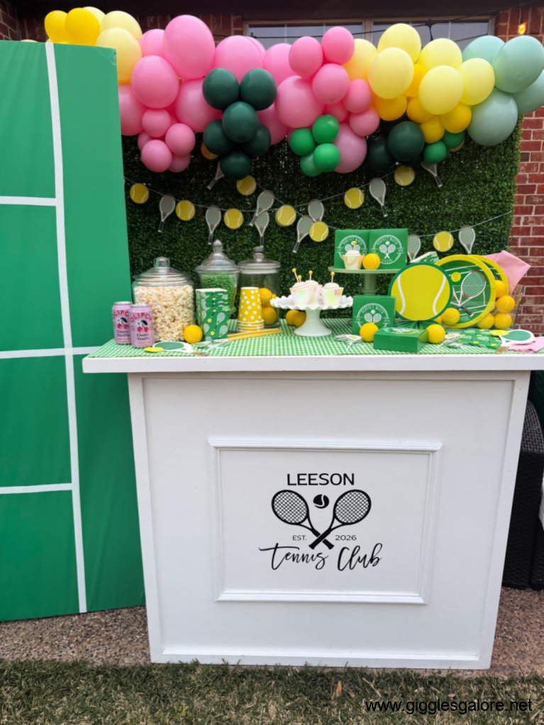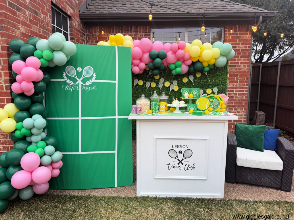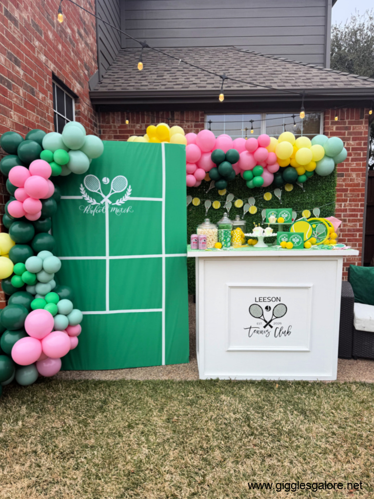 The decor for this tennis party focused on simple, intentional details that made a big impact. Shades of green and white set the foundation, while yellow tennis ball accents and playful signage tied the theme together. The focal point for this celebration was the DIY Perfect Match Tennis Court Backdrop. Using green bulletin board paper, white masking tape, and a custom logo, I created a backdrop that served as the perfect spot to take photos.