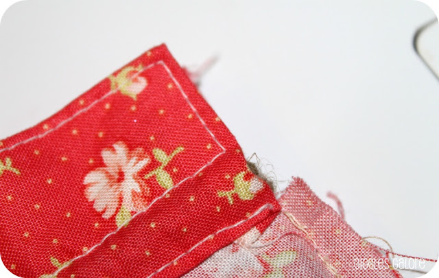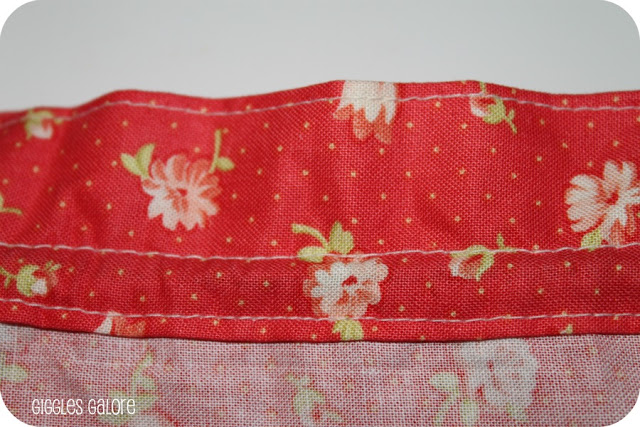 Now, it’s time to sew the top. First, sew along the very bottom and then measure from that stitch to see how wide you need to make the opening for your string. Now, sew above that stitch and continue around the sides and top until you have a nice finished look. You will have three rows of stitches, like this.