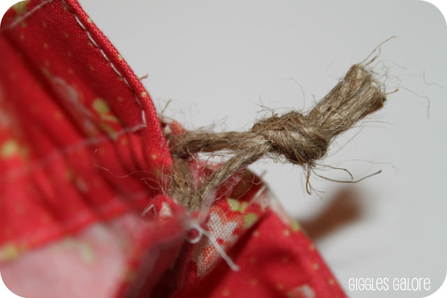 Attach a safety pin to one end of the string and thread it through both sides of the bag, repeat with the other string so you have a loop and two lose end on each side. Tie a knot in each side.