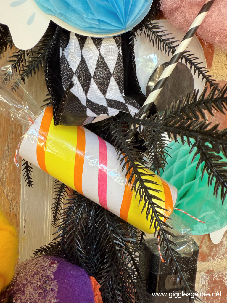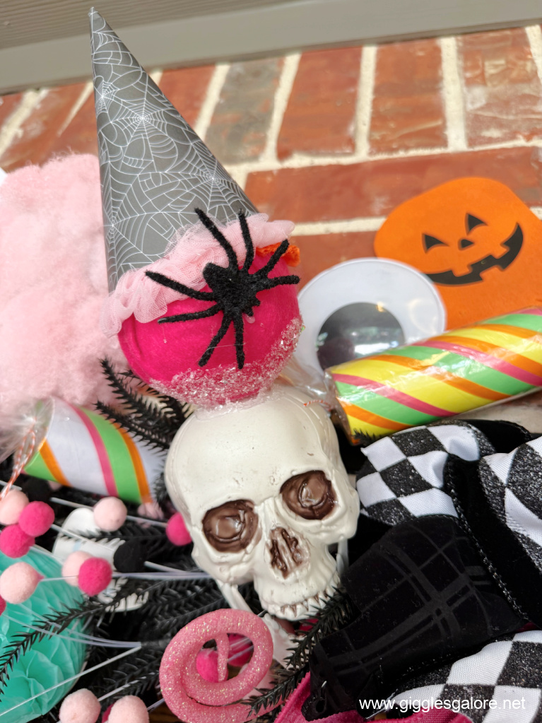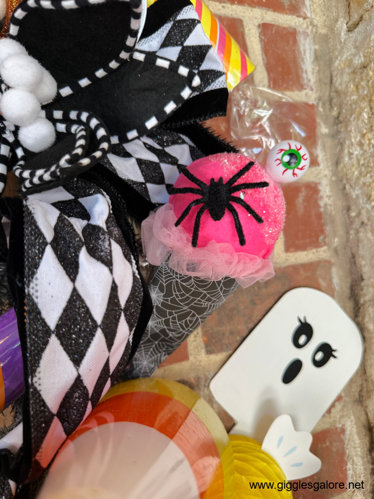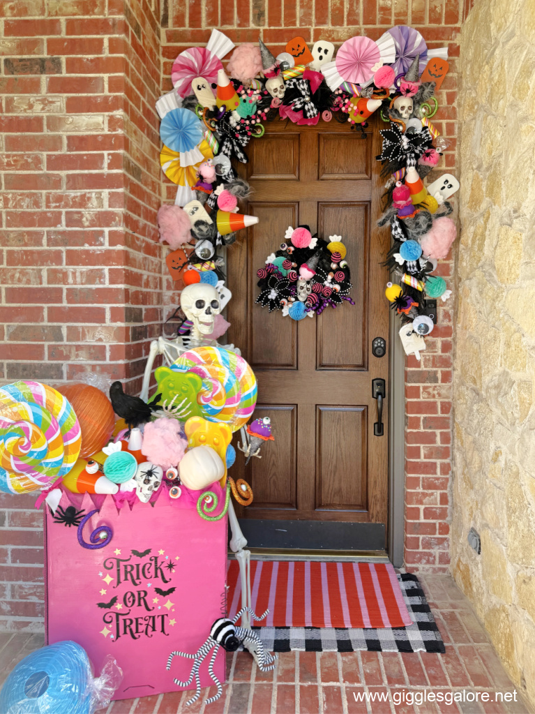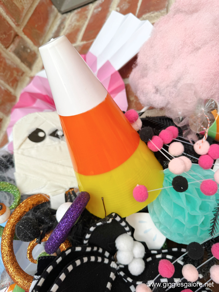I hung a black Halloween garland above the door and then added all of my DIY sweet treats. Layer in bold bows, the faux cotton candy, and candy corn cones for extra sweetness.