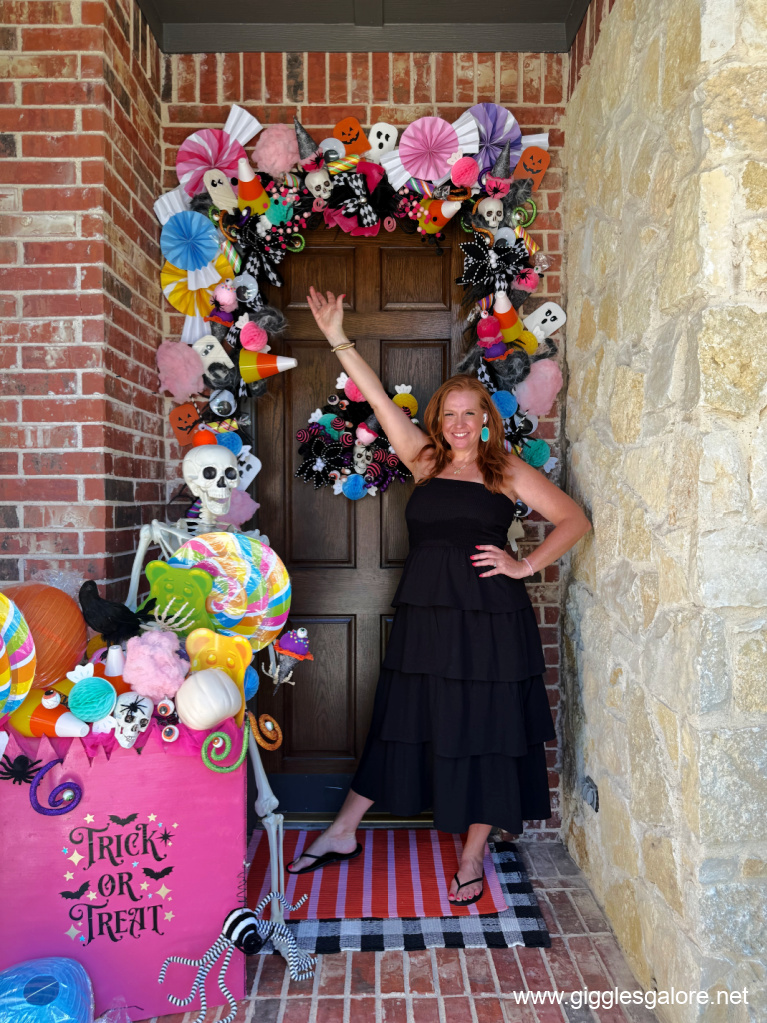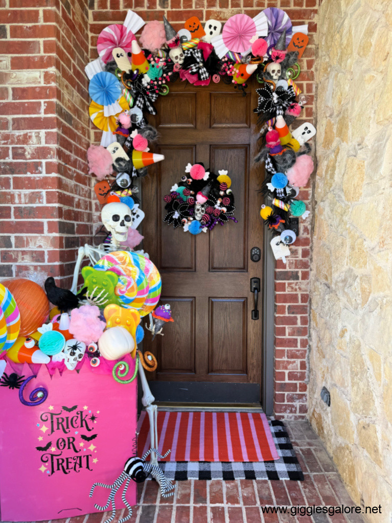 Instead of relying only on dark and eerie tones, this year I decided to use bright candy colors as my inspiration and infuse it with the perfect amount of spooky elements to create a whimsical entrance that’s sure to delight trick-or-treaters. Think oversized lollipops, cotton candy cobwebs, candy corn, and swirls of DIY EYEscream, paired with classic Halloween staples like skeletons, skulls, ghosts, and spiders. The result? A playful front porch display that’s equal parts sweet, spooky, and Instagram-worthy.