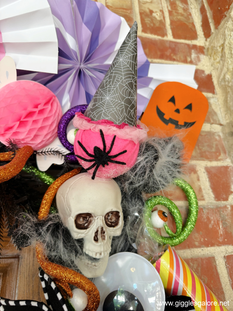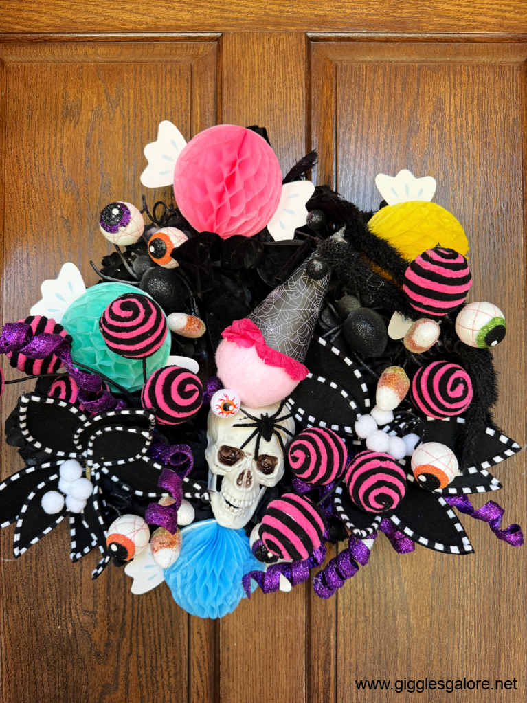 Next, I added a quirky wreath to the front door, decorated with candy-colored ornaments, spiders, and skeleton accents. Don’t be afraid to mix textures and colors for a truly eye-catching effect.