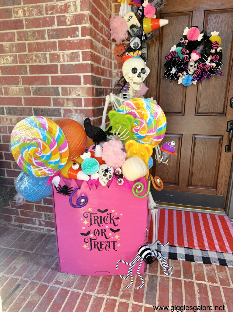 One of the standout pieces in this décor is the oversized “Trick-or-Treat” candy box display. Packed with giant lollipops, pumpkins, and spooky creatures, it sets the tone for a fun and festive Halloween. Finish the look with a striped doormat in coordinating colors to tie everything together.