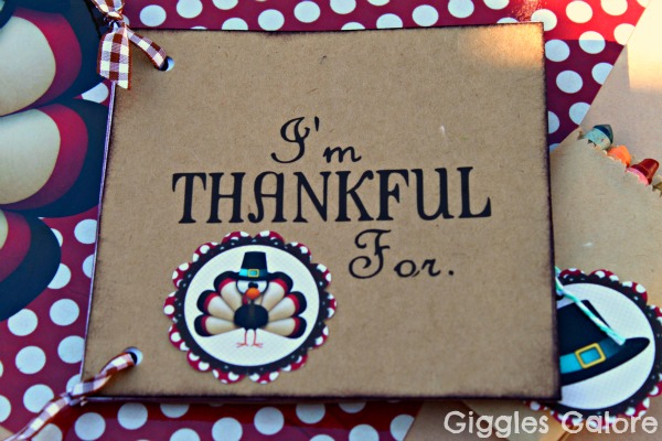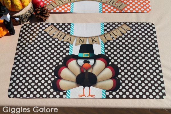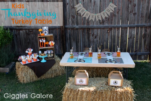 I wanted to create Thanksgiving Kids Table to keep the kids entertained and happy throughout the day. I started by setting up a “kids zone” in the backyard since our weather is typically perfect for being outside on Thanksgiving. I used hay bales as seating and also set up a small treat table on one. At each place setting there is a brown craft gable box filled with fun activities for the kids. I used the adorable place mats from the party package and laminated them so the could be used for both crafts and dinner.