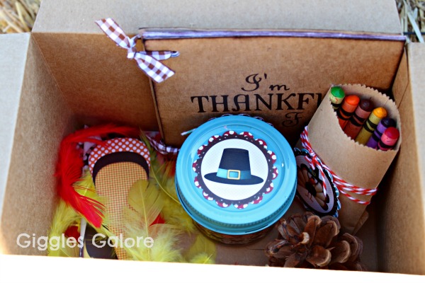 Inside the box the kids will find homemade pumpkin pie play dough, feathers, paper feathers from the printable package, embellishments pine cone, crayons and an “I’m Thankful For…” book. The kids can create their own play dough turkey, draw pictures of things they are thankful for and make a pine cone turkey…plenty of fun to keep them busy throughout the day!
