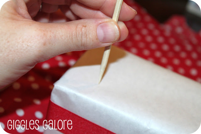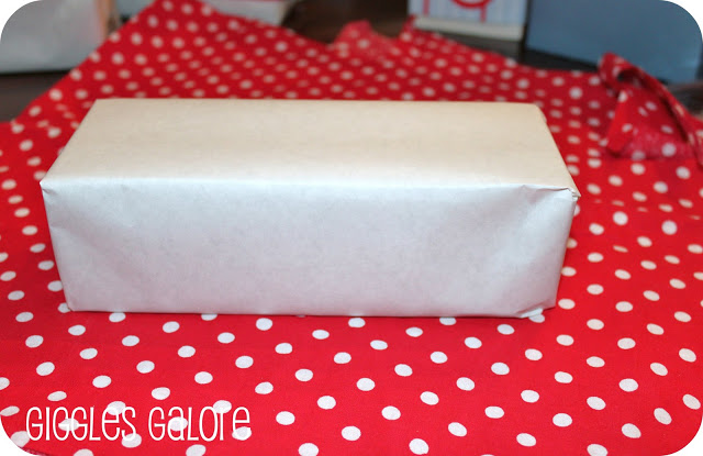 Next, wrap it in coordinating paper, like a present. I used plain white craft paper.