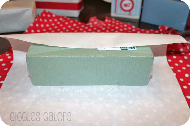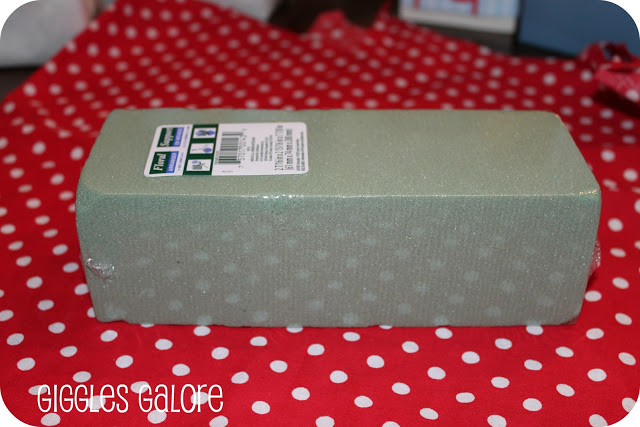First, you will need a block of foam. I buy mine at the dollar store and keep them wrapped in the plastic to eliminate the mess while working with it.