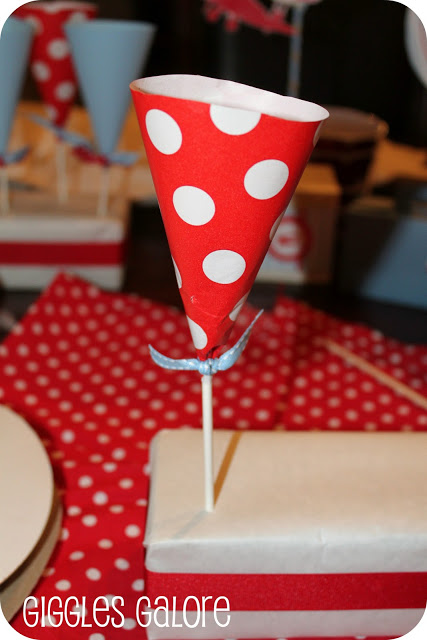 Use your coordinating paper to make the treat cones. I used the cone template and tutorial from Hostess with the Mostess.