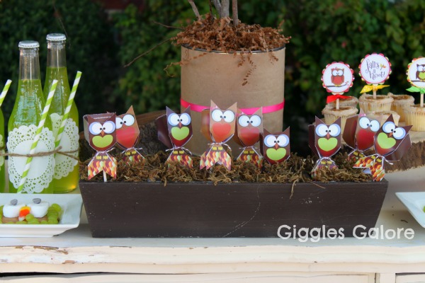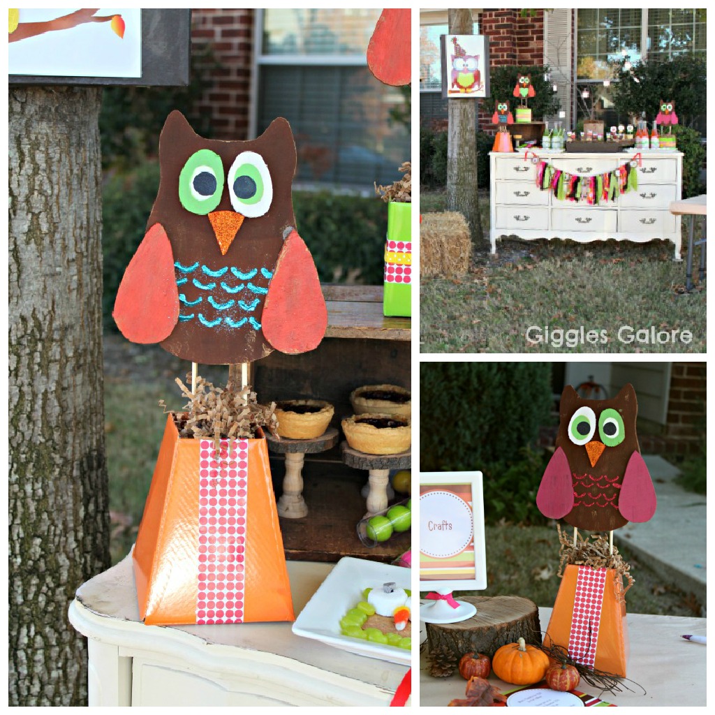 I made wooden owls and placed them in eco-chic blumebox for decorations. I used tree branched to make a “thankful tree” for the center of the table . I not only wanted to spend a fun afternoon with our friends, but also teach the kids about being thankful for our blessings. I printed out blank party circles, punched holes in them and tied twine around them. Then I had the kids write things that they are thankful for on them and then we hung them on our “thankful tree.”