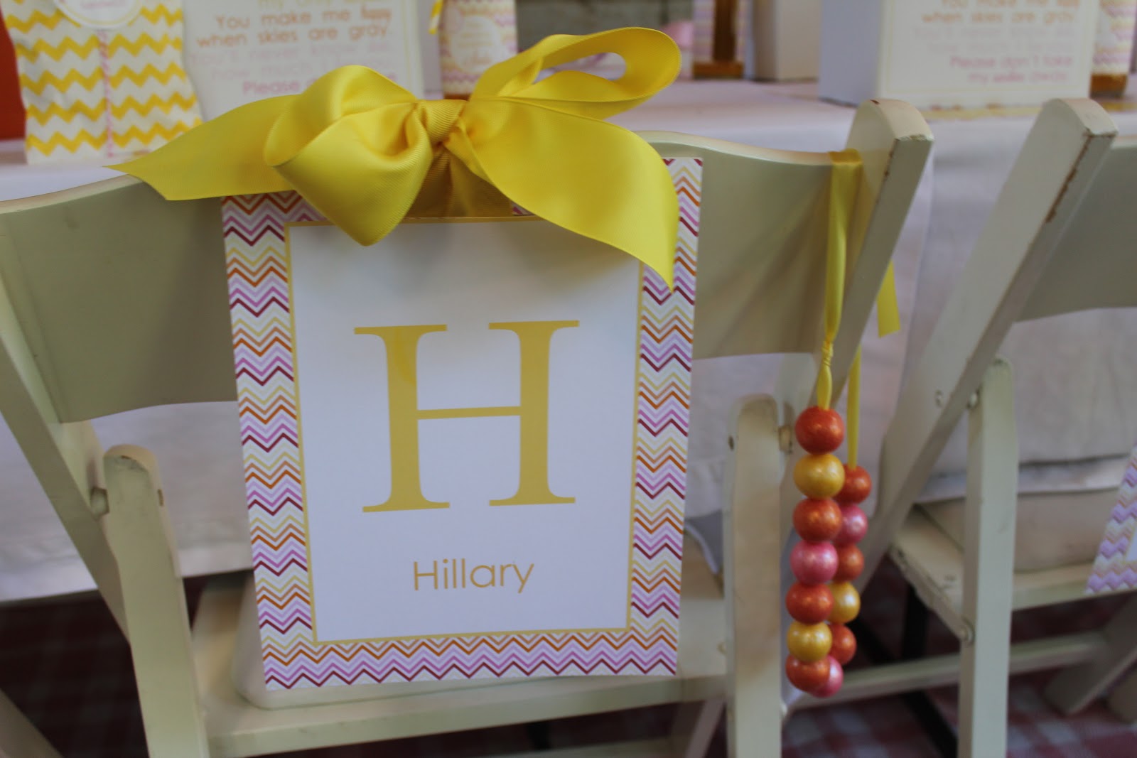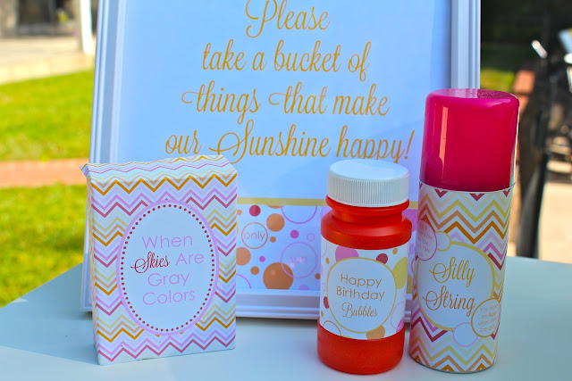 As the girls left they took a bucket of our sunshine’s favorite things which included when skies are grey colors, silly string and bubbles all wrapped in personalized labels. The printables are made with a polka dot and chevron pattern in sunset colors.