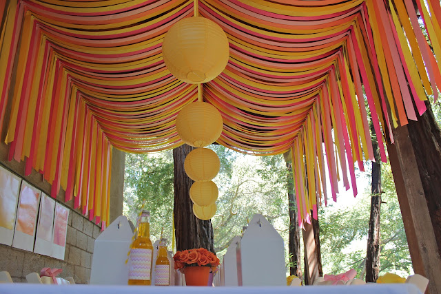 Dinner was under a canopy made from sunset colored ribbons which I had stapled to an overhang off our garage. I bought huge rolls of ribbon at the L.A. fabric district to keep costs for this down. The girls ate our only sunshine’s favorite sandwich, sun dried tomato pasta, sun chips and sunset jell-o (layers of raspberry, orange and lemon) and drank sunshine soda all of which were packaged in gable boxes. I made placemats to match the invitations and name plaques for the chair backs.